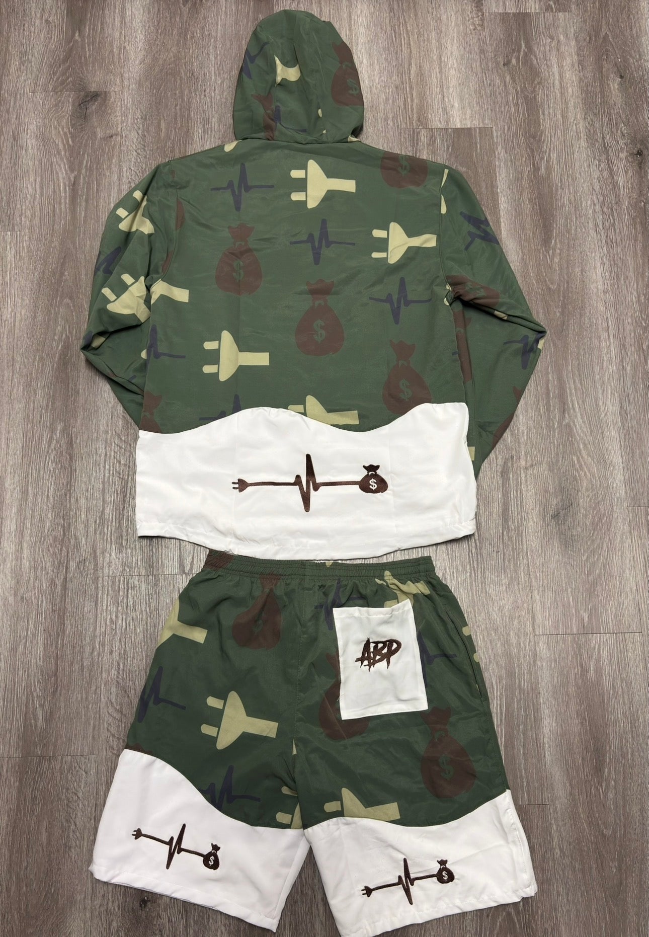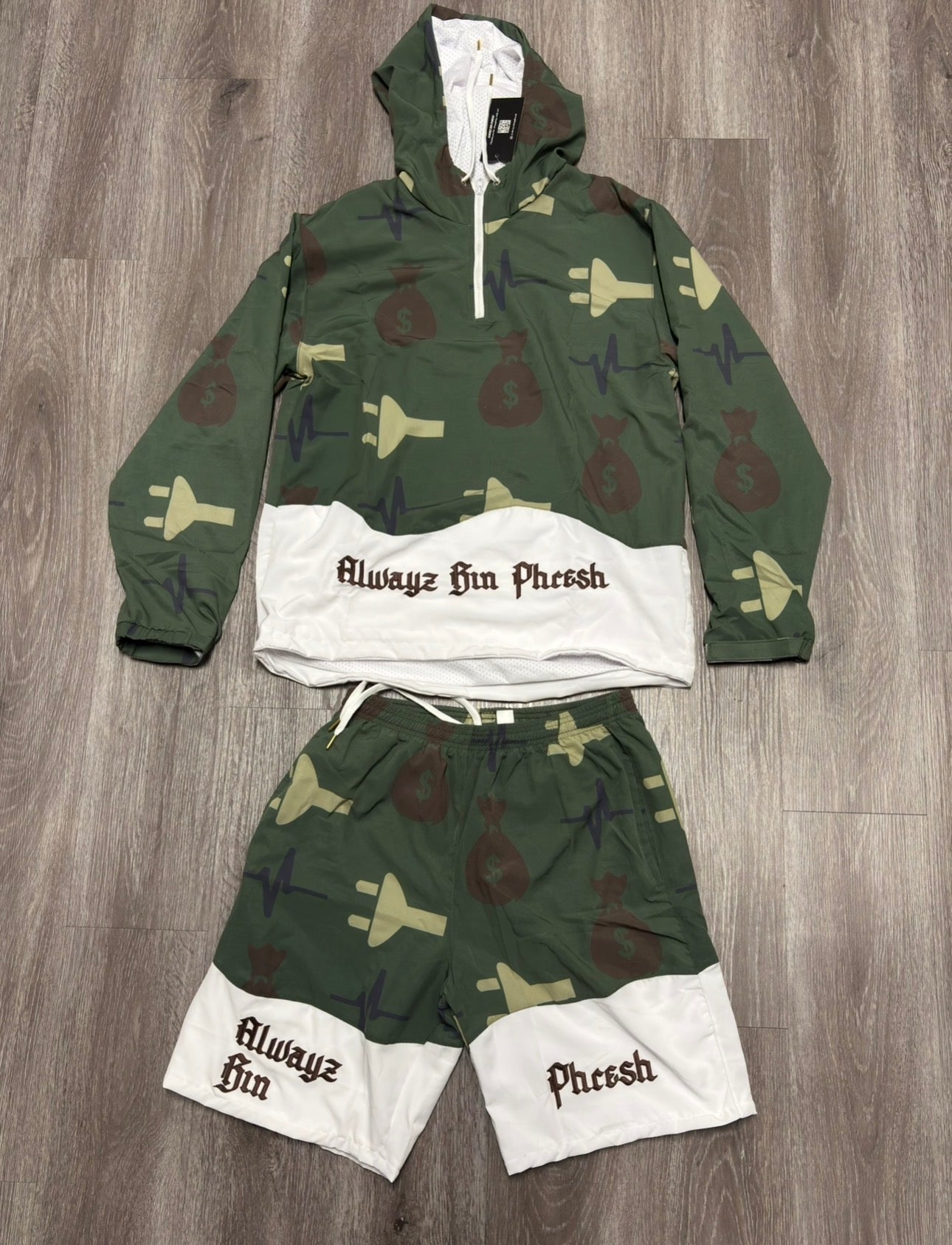 This windbreaker set features a 3/4 zip with the upper panel being a sublimation of an ABP monogram camo print, and the inside lining being white mesh. The bottom panel of the windbreaker jacket is white with brown embroidered letters Alwayz Bin Phresh on the front and the signature plug-money bag logo embroidered on the back in brown.