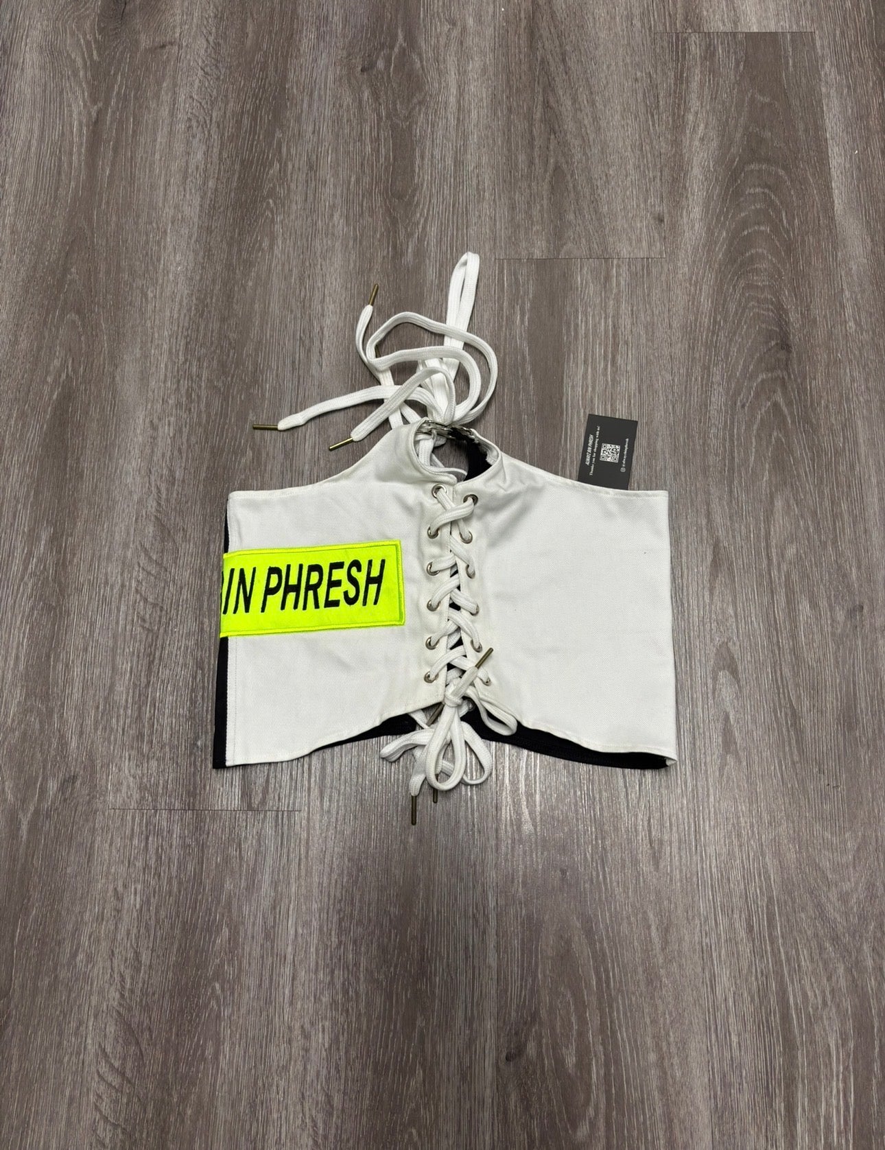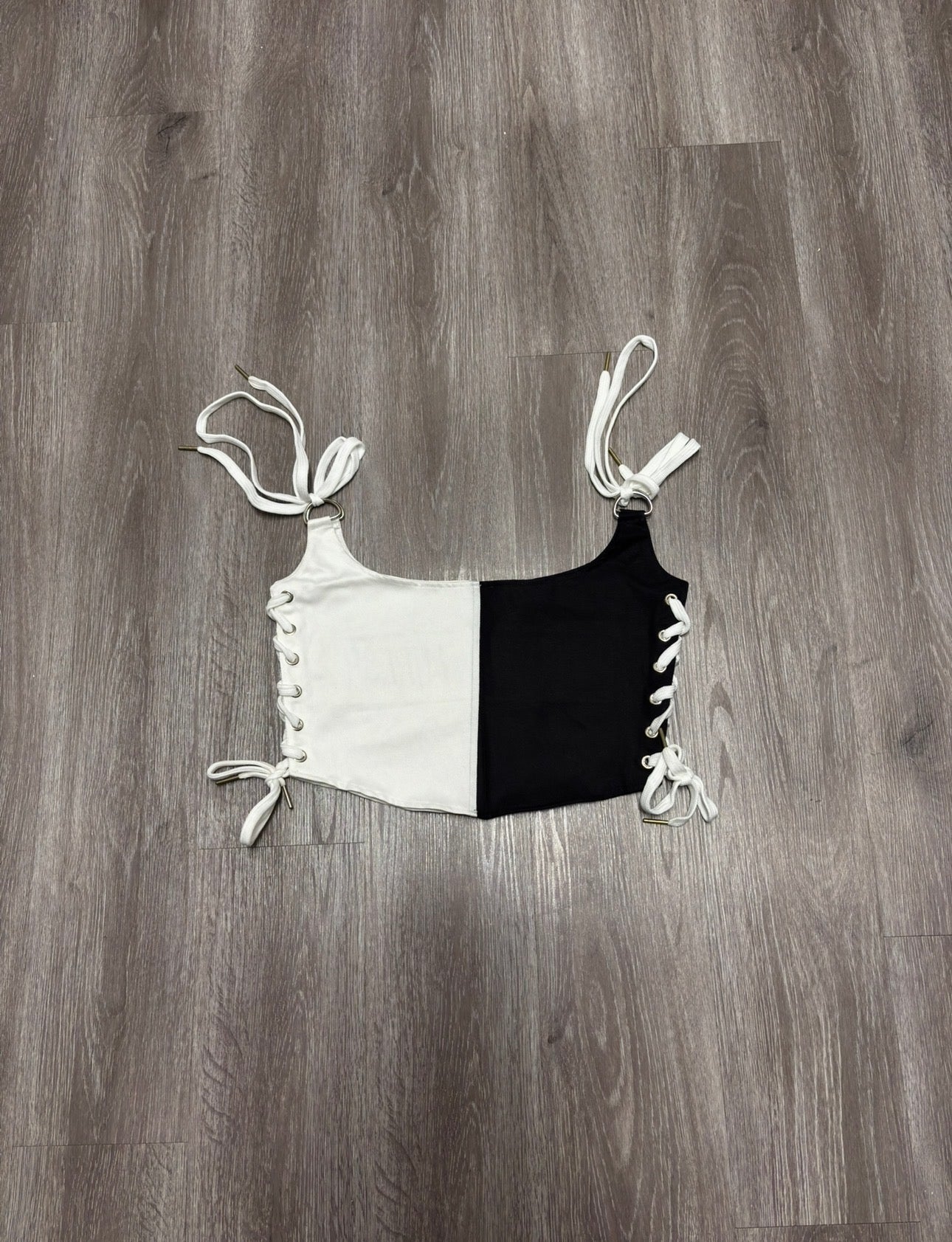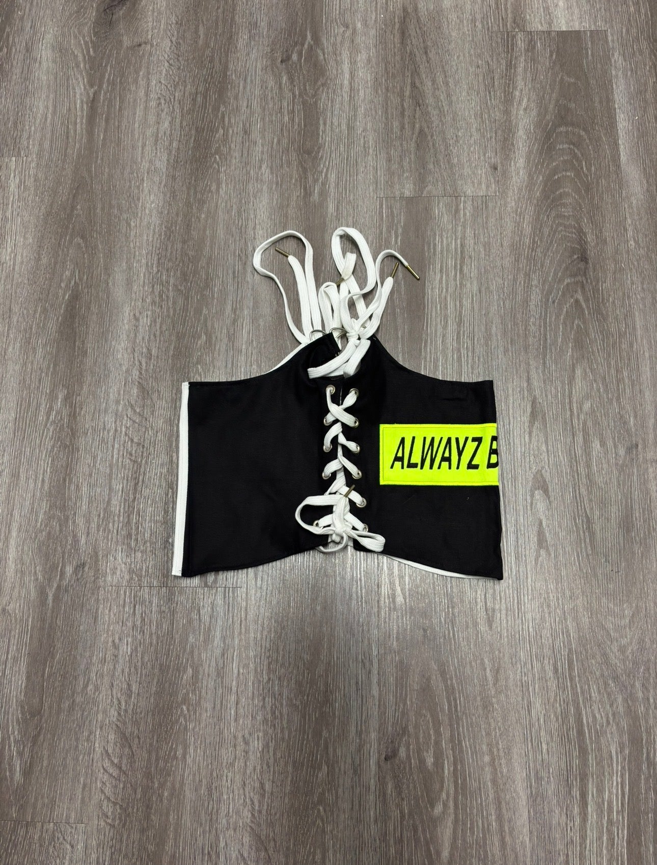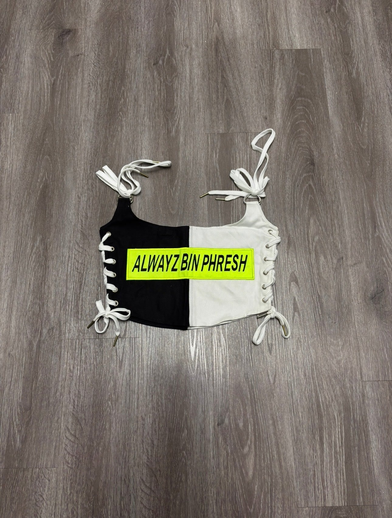This piece is 100% cotton denim. It features a contrast of black and white right down the middle. It also features a neon green applique patch, with HAND CRAFTED appliqué letters sewn by yours truly. Lastly our largest size available is a Large due to the sides and shoulders being adjusted with the white laces. This piece is definitely a must have.